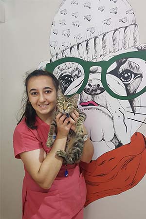 1997 izmir doğumluyum. Küçüklüğümden beri hayvanlara yardım etmek istedim. Bu yuzden Laborant ve Veteriner Sağlık bölümünü bitirdim. Hastalarımızın iyileştiğini görmek beni cok mutlu ediyor. İşimi daha çok sevmeme ve daha sıkı sarılmama sebep oluyor. Kliniğimizdeki yatan hastaların tedavisinden, bakımından ve hekimlerimize yardım etmekle sorumluyum.